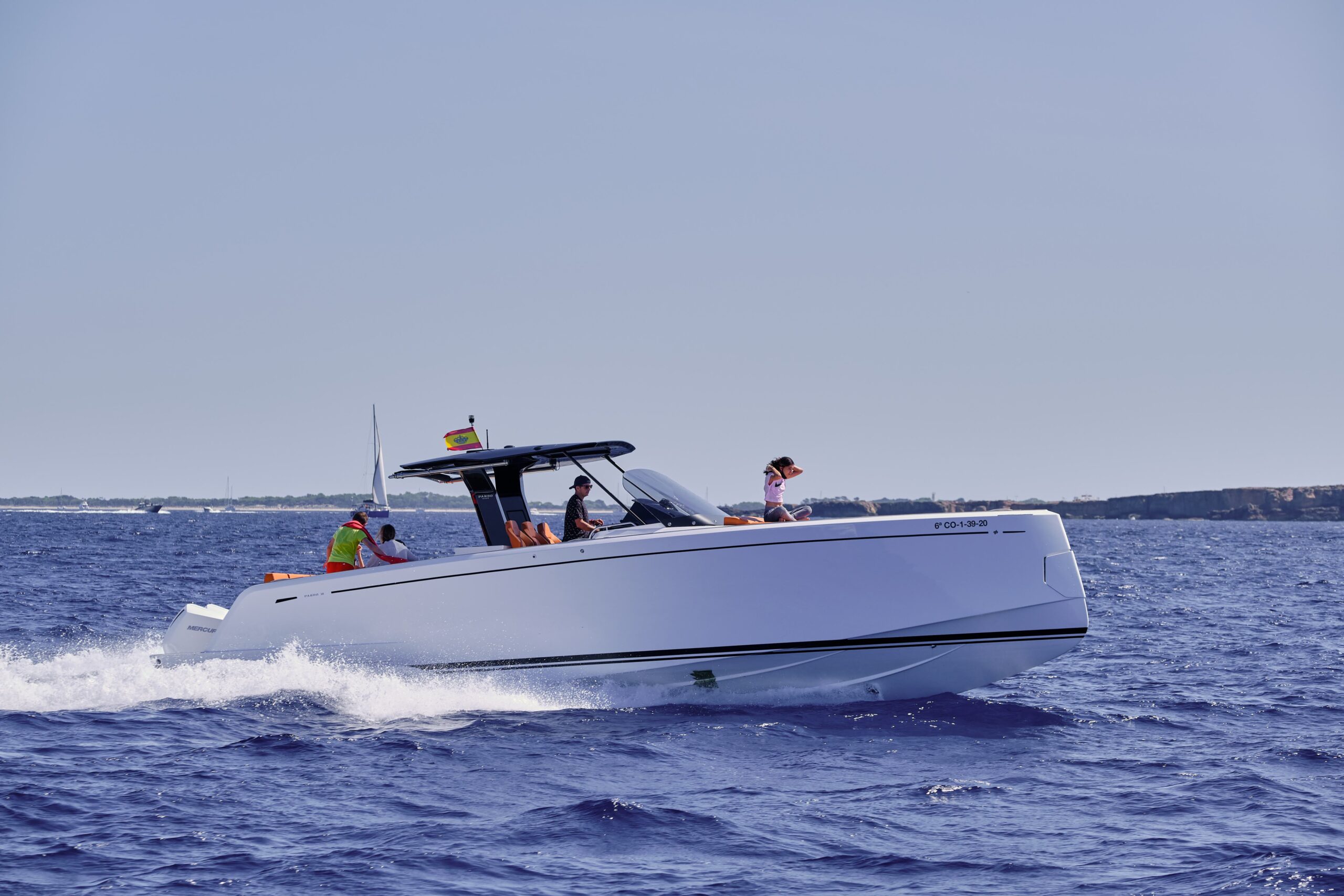 Equipada con dos motores fueraborda de 300 CV, el Pardo 38 alcanza velocidades máximas de 38 nudos y una cómoda velocidad de crucero de 25 nudos, combinando prestaciones, suavidad y eficiencia.