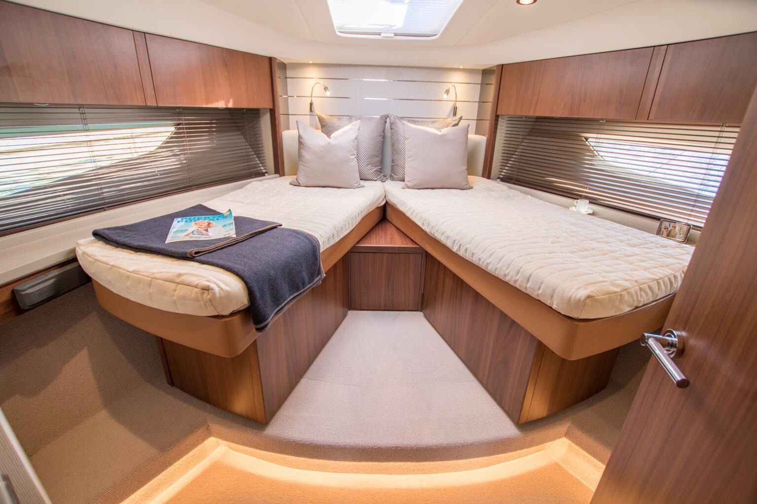 En el interior, todo invita a la desconexión: espacios abiertos, materiales nobles y una atmósfera serena que se funde con la luz natural. Sus tres camarotes están pensados para un descanso reparador, mientras que el salón interior y las zonas exteriores combinan funcionalidad, estilo y confort.