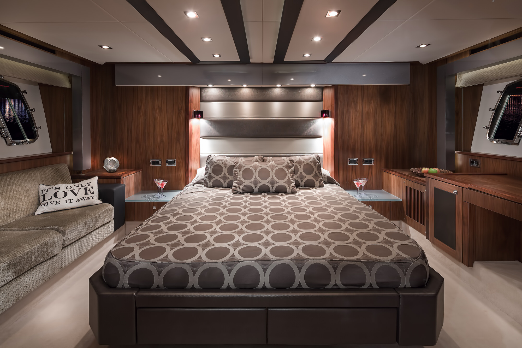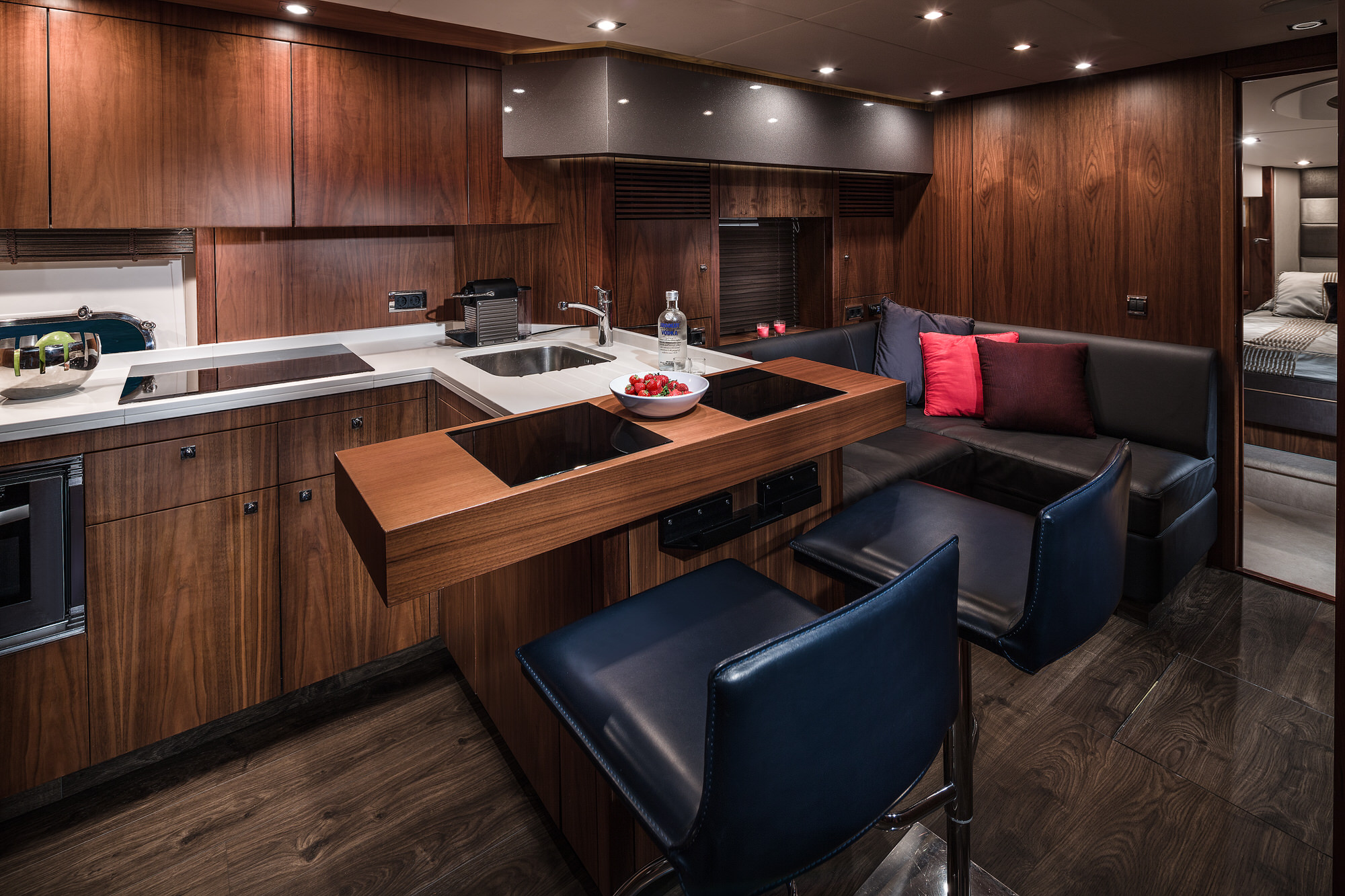 El interior es un auténtico testimonio de lujo y atención al detalle, con acabados en maderas nobles, materiales de alta calidad y una distribución pensada para el confort. Cada espacio ofrece una atmósfera cálida, refinada y acogedora, ideal para disfrutar tanto de charters de día como de estancias de varios días.